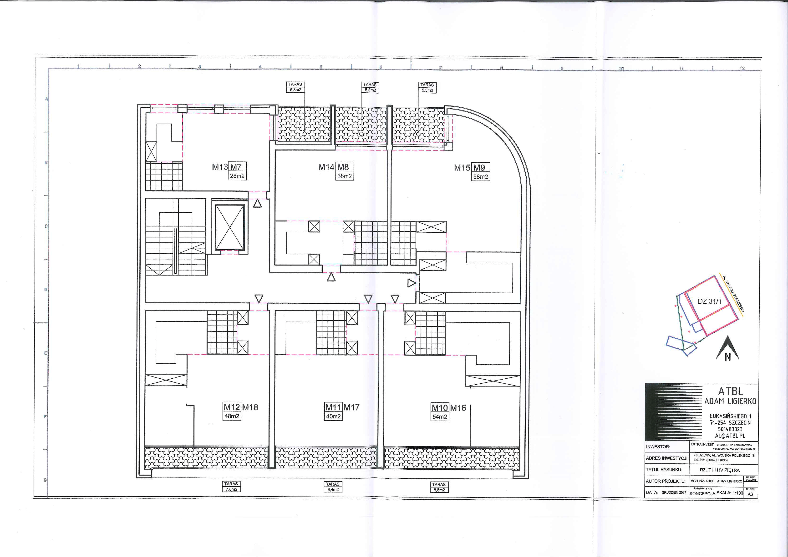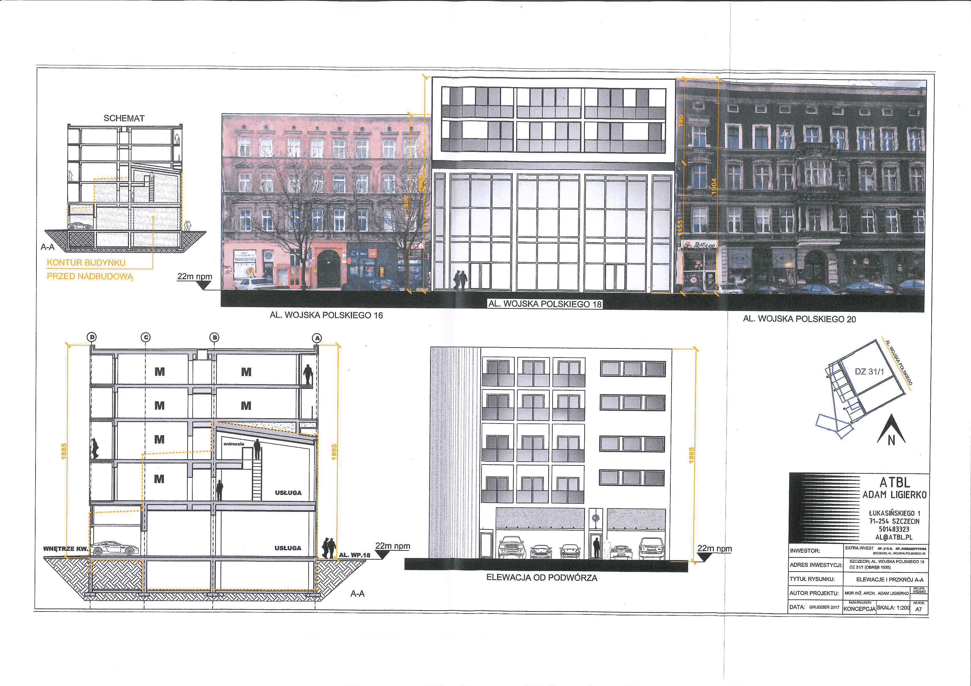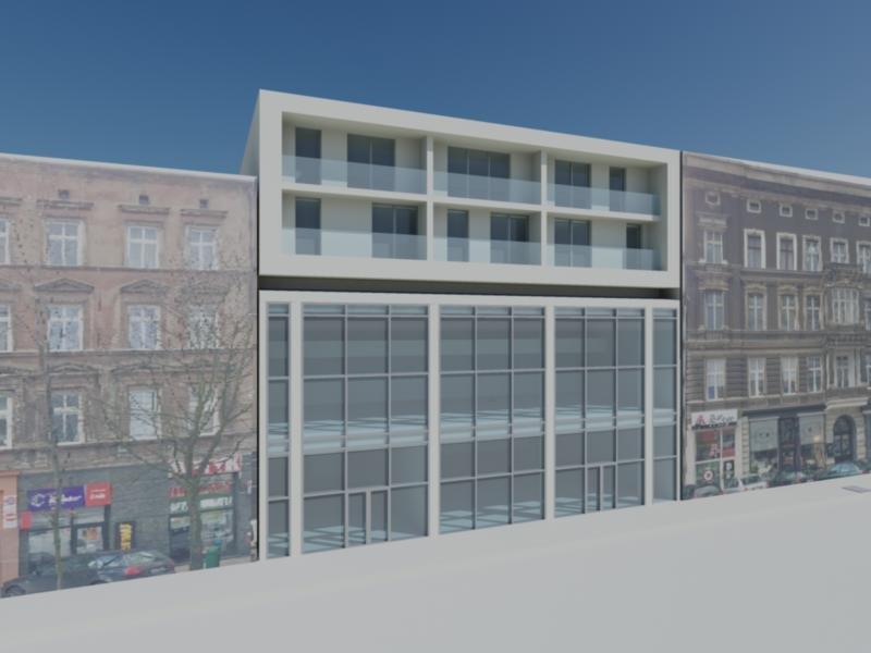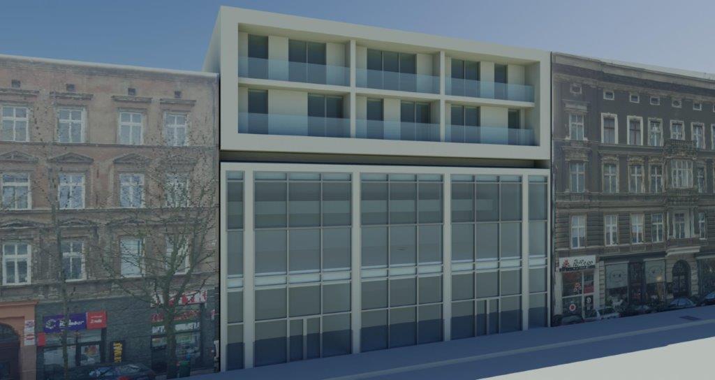 Projekt obejmuje wyodrębnienie kilkudziesięciu apartamentów wraz z lokalami użytkowymi od strony ruchliwej ulicy.
